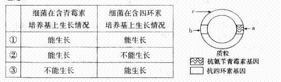 同,细菌在培养基上的生长情况也不同,下表是外源基因插入位置(插入点有a、b、c),