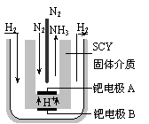 (5)随着对合成氨研究的发展,2001年两位希腊化学家提出了电解合成氨的方法,即在常压下把氢气和用氦气稀释的氮气,分别通入一个加热到570℃的电解池中,采用高质子导电性的SCY陶瓷(能传递H+)为介质,用吸附在它内外表面上的金属钯多晶薄膜做电极,实现了常压、570℃条件下高转化率的电解法合成氨(装置如下图)