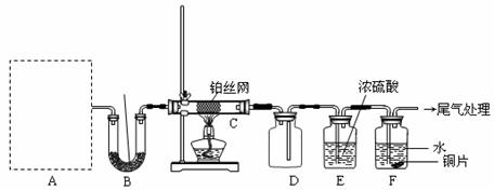 检查装置气密性后,先将C处铂丝网加热至红热,再将A处产生的气体通过B装置片刻后,撤去C处酒精灯。部分实验现象如下:铂丝继续保持红热,F处铜片逐渐溶解。