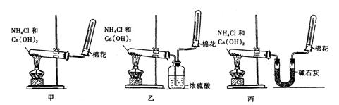 2、(6分)(2010届广西禾池中学高三上学期第一次月考)氨(NH3)是重要的含氮化合物。1774年该气体由英国普里斯特里制得。为了在实验室制取干燥的氨气,甲、乙、丙三位同学分别设计了如下三套实验装置: