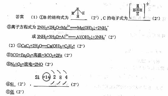 57. ( 重庆南开中学09高三9月考)(1)有A、B、C、D、E五种微粒,它们都含有10个电子。通常状况下,微粒A和B为分子,C和E为阳离子,D为阴离子;B溶于A后所得的物质可电离出C和D;A、B、E三种微粒反应后可得C和一种白色沉淀。请回答: