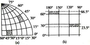 13、在右图中画斜线的四块假想陆地中面积最大的是
