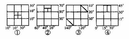 35、四幅经纬网图中,分别绘有两条粗短线,符合同一图中两条粗短线实地距离相等的是、