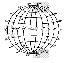 A.经度00,纬度00 B.经度1800,纬度00 C.1600 E , 纬度00 D.200W ,纬度00
