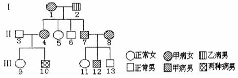 (5)若Ⅲ9与Ⅲ12结婚,生育的子女只患甲病的概率为__________,只患一种病的概率为____________________;同时患有两种病的概率为__________。