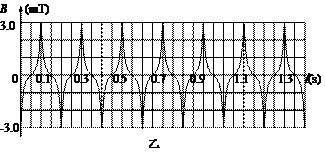 3. 某同学在实验室里熟悉各种仪器的使用.他将一条形磁铁放在水平转盘上,如图甲所示,磁铁可随转盘转动,另将一磁感应强度传感器固定在转盘旁边当转盘(及磁铁)转动时,引起磁感应强度测量值周期性地变化,该变化的周期与转盘转动周期一致.经过操作,该同学在计算机上得到了如图乙所示的图像.