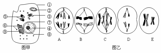 (1)图甲中属于生物膜系统的结构有 (填标号)。细胞进行图乙过程时所需能量主要来自图甲中的[ ]______,纺锤体的形成与[ ] 有关