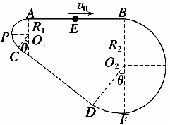 36(20分)、如图所示,是放置在竖直平面内的游戏滑轨的模拟装置,滑轨由四部分粗细均匀的金属杆组成。AB为水平直轨,CPA与BFD圆形轨道的半径分别为R1=1.0 m和R2=3.0 m,而倾斜直轨CD的长为L=6 m, AB、CD与两圆形