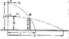 25、如图所示,从高为H的地方A平抛一物体,其水平射程为2s。在A点正上方高度为2H的地方B点,以同方向平抛另一物体,其水平射程为s,两物体在空中的轨道在同一竖直平面内,且都是从同一屏M的顶端擦过,求屏M的高度是多少。
