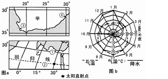 (3)①②③④四地中,与图b所示气候类型相符的有 和 ,该气候的形成原因是 。(4分)
