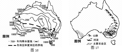 (2)澳大利亚大陆年降水量空间分布特点是 , A地位于印度洋沿岸,试分析其降水较少的原因。 (4分)