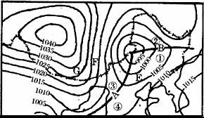 图中影响我国东北地区的为一气旋,A、B处等压线向外突出的部分为两个低压槽,锋面一般就形成于这些低压槽中。具体情况见下表: