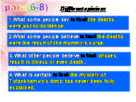 Carter was at the gate of the tomb. Let’s following him to get into it. After students finish watching , ask questions: what are there in the tomb? What would you do if you see these treasures? What did they do according to paragraph 3? Is it right to empty other’s tomb of everything? Were they lucky although they became rich?