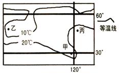 右下图为某大陆与相邻海洋某月平均气温的等值线分布图,且乙、丙处于不同的下垫面(此处指大陆和海洋),回答2-3题: