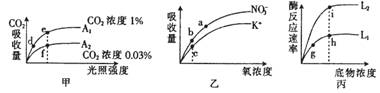5.下图甲表示将A植物放在不同浓度的CO2环境条件下,A植物光合效率受光照强度影响的变化曲线;图乙表示胡萝卜在不同的含氧情况下从硝酸钾溶液中吸收K+ 和NO3-的曲线;图丙表示不同酶量时底物浓度和酶反应速率的关系曲线。相关说法正确的是 ( )