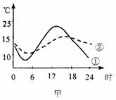 在下图中,甲图表示的是某滨海地区陆地和海洋表面气温日变化的曲线图。