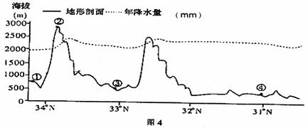 图4是“沿106.5°E经线的地形剖面及相关气候资料图”,据图回答50题。
