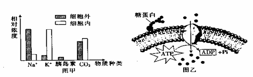 24.图甲表示四种不同的物质在一个动物细胞内外的相对浓度差异。其中通过图乙所示的过