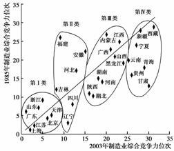 (2)1985-2003年制造业综合竞争力没有发生变化的地区是 ,其制造业发展的优势区位条件是 。