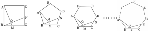 2、将1题中的“正△ABC”分别改为正方形ABCD,正五边形ABCDE,正六边形ABCDEF,……,正n边形ABCD…N,其余条件不变,根据第1题的求解思路分别推断∠AQN的度数,将结论填 入下表: