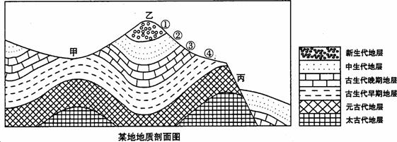 2.在图中数码①②③④所示地层中,有可能找到大量三叶虫化石的地层数码是 ,有可能找到恐龙蛋化石的地层数码是 ,早期人类遗迹应该到数码 代表的地层中去寻找。