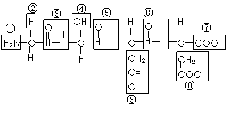 (1)该结构式中表示氨基的是(填序号) ,表示羧基的是(填序号) ,共有 个氨基, 羧基。