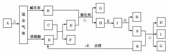 下图中A-K分别代表有关反应的一种反应物或生成物,其中A、C、F、K是固体,且A是一种不含金属元素的盐,受热分解能得到三种物质的量相等的产物,A加热后生成的气体混合物若通过碱石灰,只剩余气体B(B为无色有刺激性气味的气体),若通过浓硫酸则只剩余气体D(D为无色无味气体);C为淡黄色固体。各物质间的转化关系如下图所示: