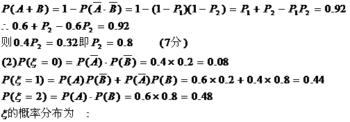则P(A)=P1=0.6, P(B)=P2