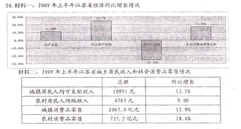 34.(1)根据材料一、二,概括2009 年上半年江苏经济增长情况。(6分)