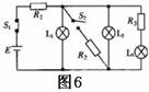 如图6所示,电动势为E、内阻不计的电源与三个灯泡和三个电阻相接。只合上开关S1,三个灯泡都能正常工作。如果再合上S2,则下列表述正确的是( )![]()
