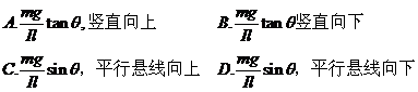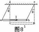 如图8所示,用两根轻细金属丝将质量为m,长为l的金属棒a、b悬挂在c、d两处,置于竖直向上的匀强磁场内.当棒中通以从a到b的电流I后,两悬线偏离竖直方向θ角处于平衡状态.为了使棒平衡在该位置上,所需的最小磁场的磁感强度B'的大小、方向是( )