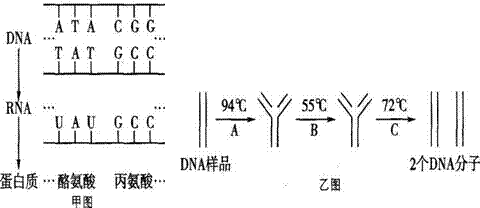 53.(14分)下面甲图中DNA决定某一多肽链中的酪氨酸和丙氨酸过程示意图,乙图示样品 DNA经PCR技术(聚合酶链式反应)扩增,可以获取大量DNA克隆分子。分析回答: