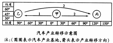 14.读图,第二次汽车产业转移开从甲、乙两地转移到丙地。进入20世纪80年代,