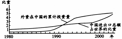 读“1980-2003年我国进出口总额和外资直接投资累计量占世界比重变化图”,回答17-18题。