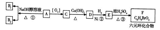 某研究人员发现一个破裂的小瓶中渗漏出一未知有机物A,有催泪作用。经分析A的相对分子质量为161,该化合物中除含有C、H元素外还含有一种卤族元素,且分子中只含有一个甲基。化合物A-F的转化关系如下图所示,其中1molC与足量的新制Cu(OH)2溶液反应可生成1molD和1mol Cu2O,B1和B2均为较稳定的化合物且互为同分异构体。