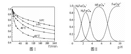(2)将适量K2FeO4溶解于pH=4.74的溶液中,配制成c(FeO42-) =1.0 mmol·L-1的试样,将试样分别置于20℃、30℃、40℃和60℃的恒温水浴中,测定c(FeO42-)的变化,结果见图Ⅰ。该实验的目的是 ;发生反应的△H 0(填“>”、“<”或“=”)。