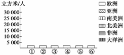 (2)在坐标图中,按由多到少的顺序和图例要求画出六大洲人均径流量柱状图。(横坐标每格代表一个大洲,每小格只是一个基数,在此位置可画出各洲相应柱状图。)