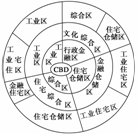 图中CBD表示哪一种功能区?请说出其空间分布特点及主要职能。图中还缺少一种功能区,请写出其名称并简要说明其地理意义。