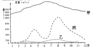 右图是我国三个地区的甲.乙.丙三条河流各月流量(立方米/秒)图,读图回答8-10题。![]()
