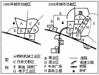 46.下图为我国华北地区某城市1980年和2009年城市功能区分布图.比较两幅图,回答有关问题。(10分)