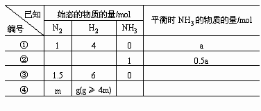 已知加入1 mol N2、4 mol H2时,达到平衡后生成a mol NH3(见表中已知项),在相同温度和压强下保持平衡后各组分体积分数不变,对下列编号②-④的状态,填写表中空白。