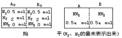 设想我们可以用隔板将①中平衡状态均分为A、B两部分,那么A(B)与整体当然处于等效平衡且A(B)中NH3的量为0.5a mol,所以我们可认为A(B)部分为②的平衡态,那么达到B平衡态的初始状态当然也为达到①平衡态的初始状态的一半,即可用下图表示: