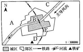 33.右图是“某个城市的工业布局规划示意图”,读图分析回答问题。(13分)
