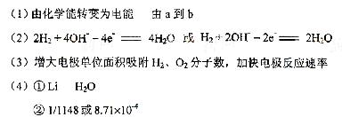 [解析]本题考查电化学知识。(1)原电池的实质为化学能转化成电能。总反应为2H2 + O2 =2H2O,其中H2从零价升至+1价,失去电子,即电子从a流向b。(2)负极为失去电子的一极,即H2失电子生成H+,由于溶液是碱性的,故电极反应式左右应各加上OH-。(3)铂粉的接触面积大,可以加快反应速率。(4)I.Li从零价升至+1价,作还原剂。II.H2O的H从+1降至H2中的零价,作氧化剂。由反应I,当吸收10molH2时,则生成20molLiH,V=m/ρ=20×7.9/0.82 ×10-3L=192.68×10-3L。V(LiH)/v(H2)= 192.68×10-3L/224L=8.71×10-4。20mol LiH可生成20mol H2,实际参加反应的H2为20×80%=1.6mol,1molH2转化成1molH2O,转移2mol电子,所以1.6molH2可转移3.2mol的电子