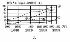 材料二 “部分国家城市化及其经济发展情况统计图”(图甲)和“部分国家城镇人口在总人口中所占百分比统计图”(图乙)。