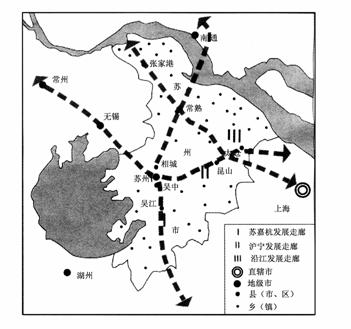 (2009·福建)近年来,苏州市沿江地带形成以冶金、能源、纺织、化工、粮油等基础产业为主的产业群体。下图中的Ⅰ、Ⅱ、Ⅲ示意苏州市城市化、工业化发展走廊。完成1-3题。