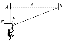(12分)特种兵过山谷的一种方法可简化为图示情景。将一根长为2d的不可伸长的细绳两端固定在相距为d的A、B两等高点,绳上挂一小滑轮P,战士们相互配合,沿着绳子滑到对面。如图所示,战士甲水平拉住滑轮,质量为m的战士乙吊在滑轮上,脚离地,处于静止状态,此时AP竖直,然后战士甲将滑轮从静止状态释放,若不计滑轮摩擦及空气阻力,也不计绳与滑轮的质量,求: