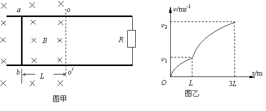 16.(15分) 如图甲,相距为L的光滑平行金属导轨水平放置,导轨一部分处在垂直导轨平面的匀强磁场中,oo/为磁场边界,磁感应强度为B,导轨右侧接有定值电阻R,导轨电阻忽略不计。在距oo/为L处垂直导轨放置一质量为m、电阻不计的金属杆ab。