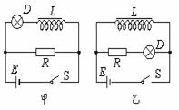 如图所示,电路甲、乙中,电阻R和自感线圈L的电阻值都很小,接通S,使电路达到稳定,灯泡D发光,则 ( )![]()