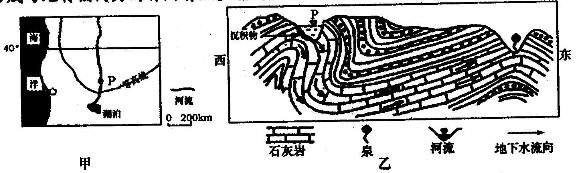 下图中甲为某区域示意图,乙反映甲中的P地河谷及其附近地质剖面,P地河谷剖